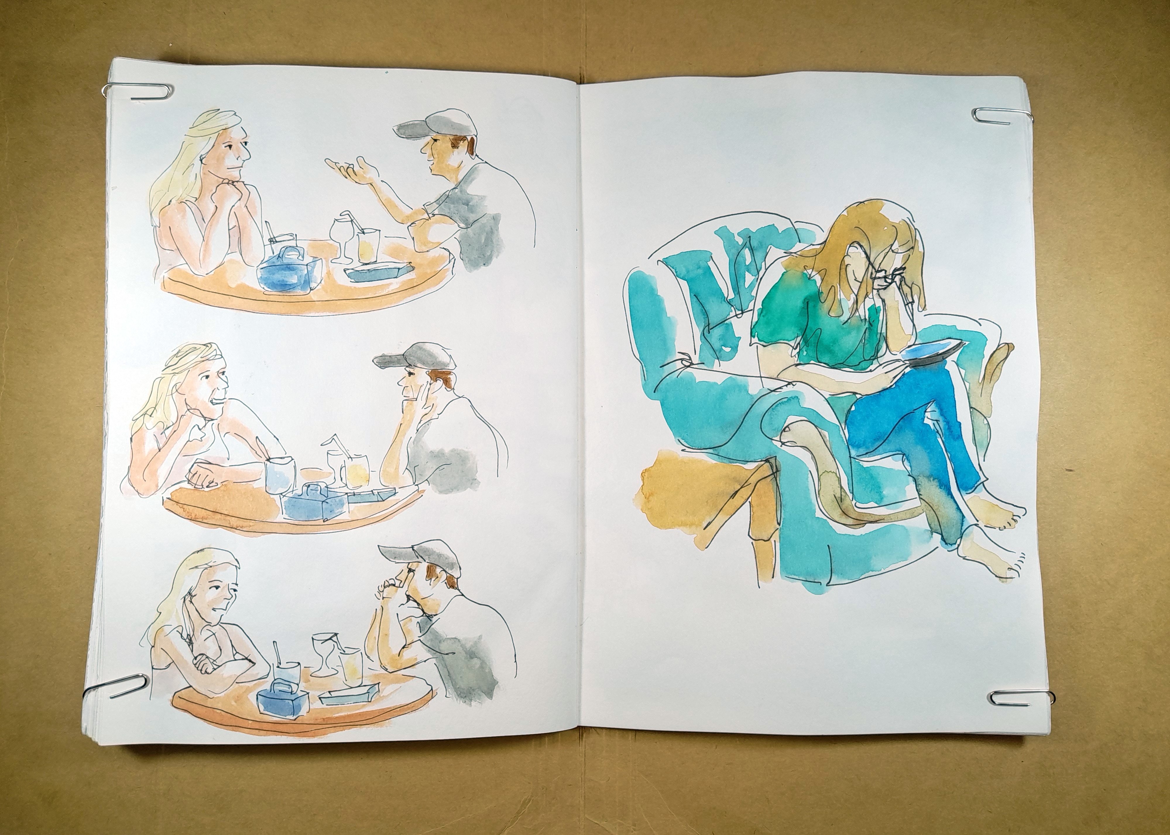 Tried and failed to get a satisfactory likeness on the left page, and the colours feel washed out. Tried being looser with the colours on the right page.