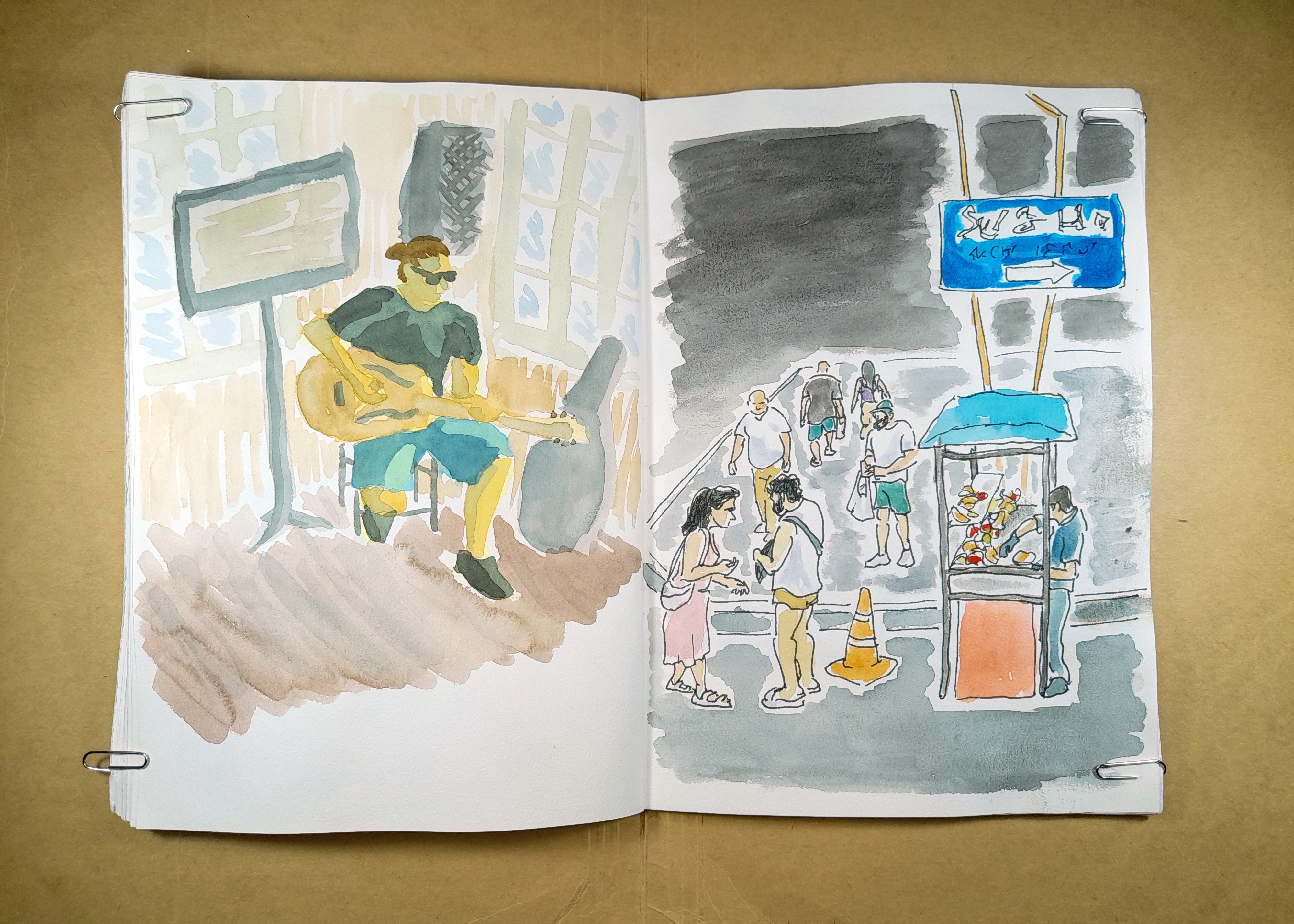 Tried some more scenes for this spread. The background on the left page would probably benefit from being darker, but still pretty happy with the piece’s clarity. In contrast, the right page is probably too dark and feels too busy; it’s almost crowding out the human elements.